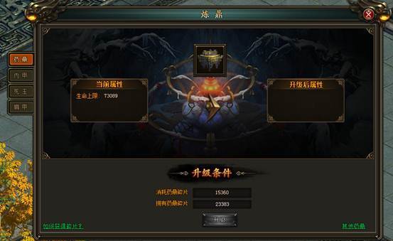 药鼎分为30级,等级越高的药鼎能够提供给角色更高的生命值加成,让你在打BOSS、PK当中不在为血少而烦恼。